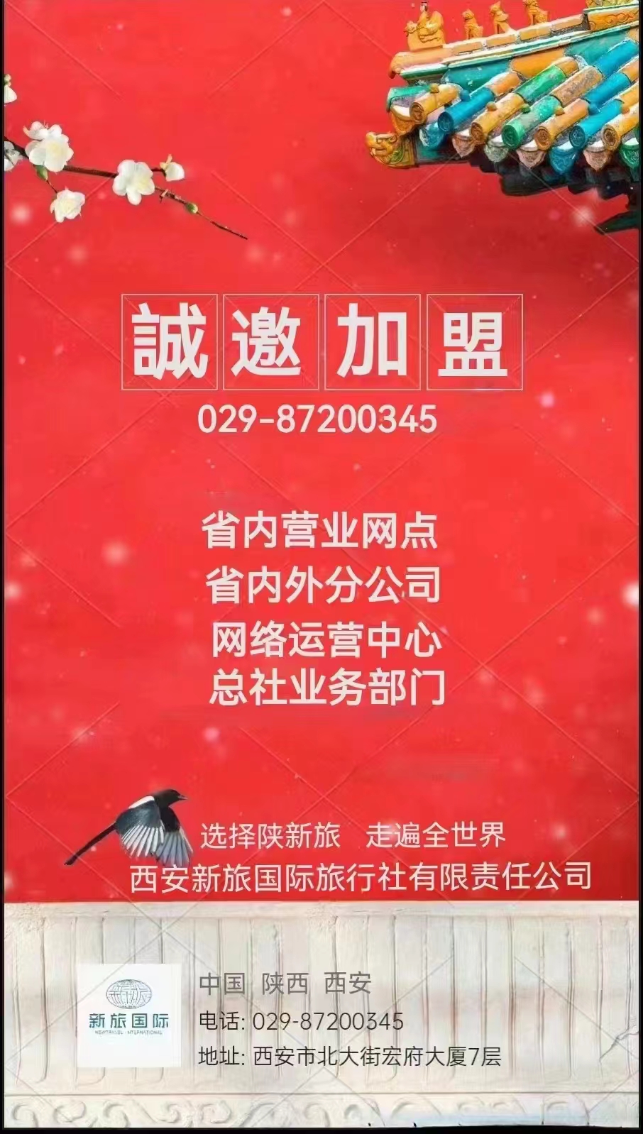 歡迎各地的有識之士能加盟到我們團隊中來,資源共享、共謀發(fā)展!為旅行創(chuàng)造精彩,讓游客感動生活;選擇陜新旅,走遍全世界!