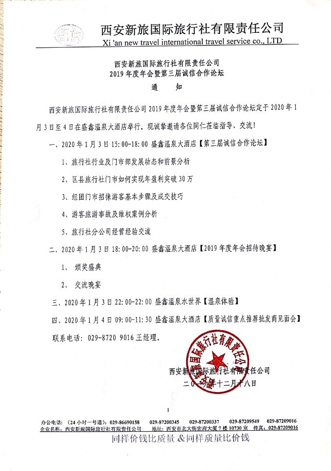 西安新旅國際旅行社有限責(zé)任公司2019年度年會暨第三屆誠信合作論壇於2020年元月3日至4日在盛鑫溫泉假日酒店舉行,誠邀旅游界同仁及合作伙伴前來參會交流!
